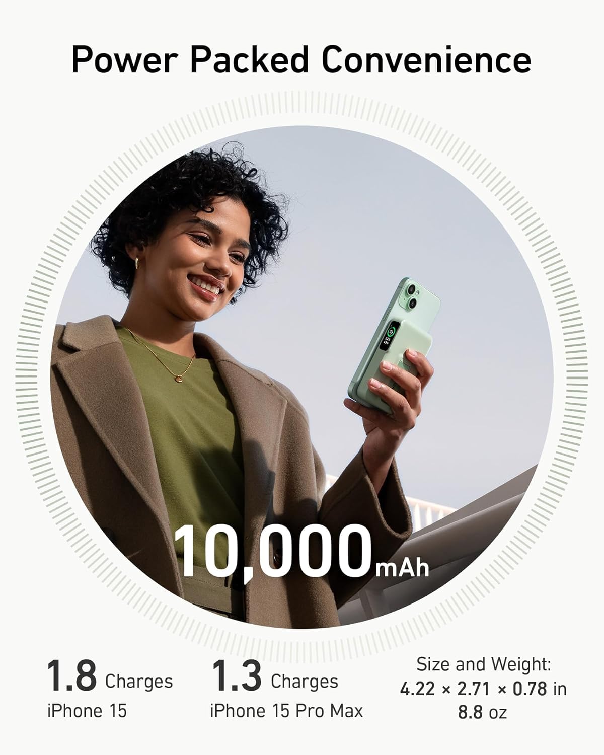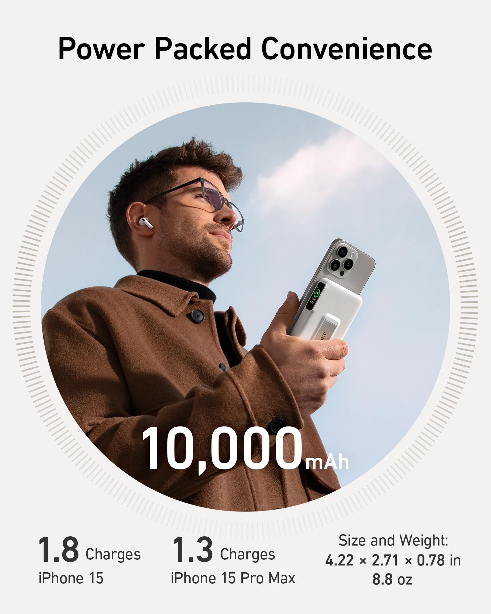 Anker MagGo Power Bank, Qi2 Certified 15W Ultra-Fast MagSafe-Compatible Portable Charger, 10,000mAh Battery Pack with Smart Display & Foldable Stand, For iPhone 15/14/13 Only (USB-C Cable Included)
