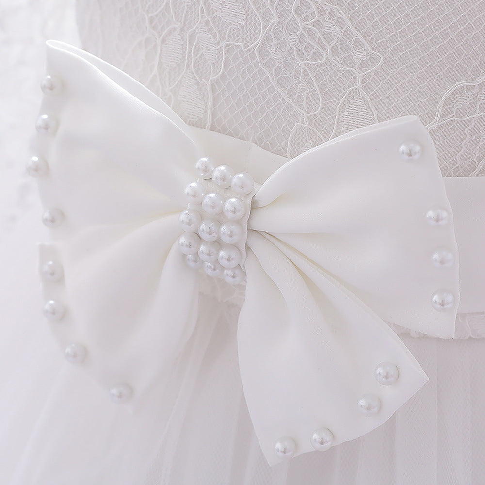 Baby Girl Bow Patched Design Long Sleeves Full Moon Christening Mesh Formal Dress