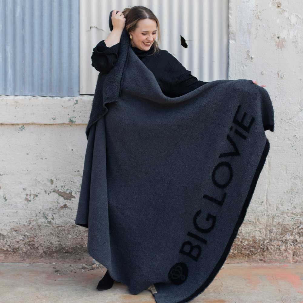 Knitted in our signature microchenille and feather yarn combo, making the silkiest, softest blanket in a gorgeous midnight color of charcoal gray and black. The name BIG LOViE and iconic Infinite Love logo pop off the blanket's edge in a rich luxurious fluff.