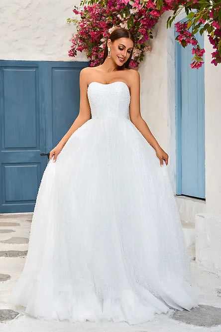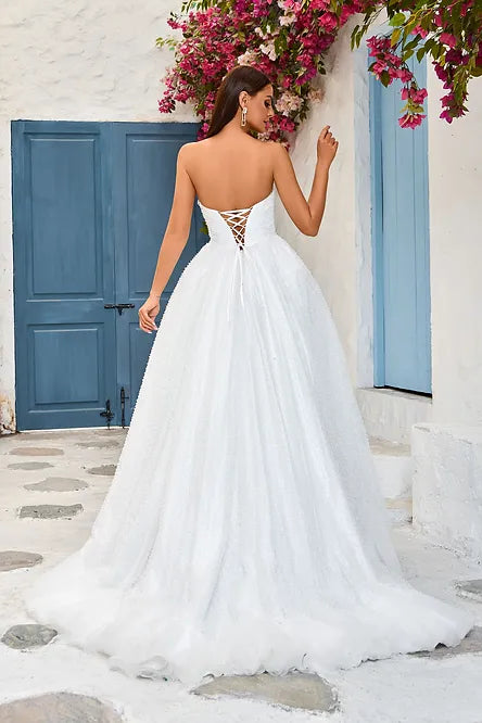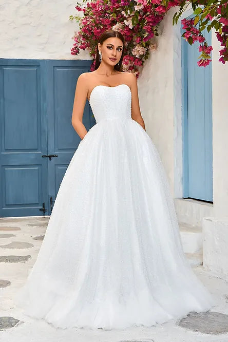 Elevate your wedding day in our luxurious JA7013 gown. The sweetheart neckline and lace detailing exude elegance and sophistication, while the A-line silhouette cinches at the waist for a flattering fit. The strapless design and corset back add an exclusive touch, and hidden pockets provide convenience without compromising style. Available in ivory.