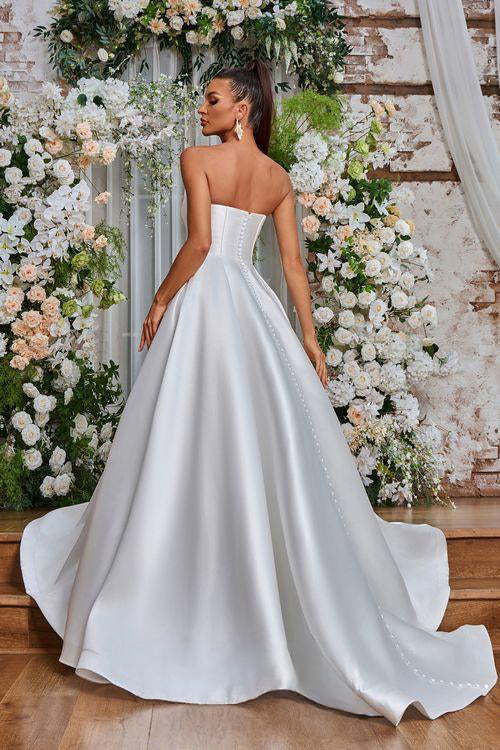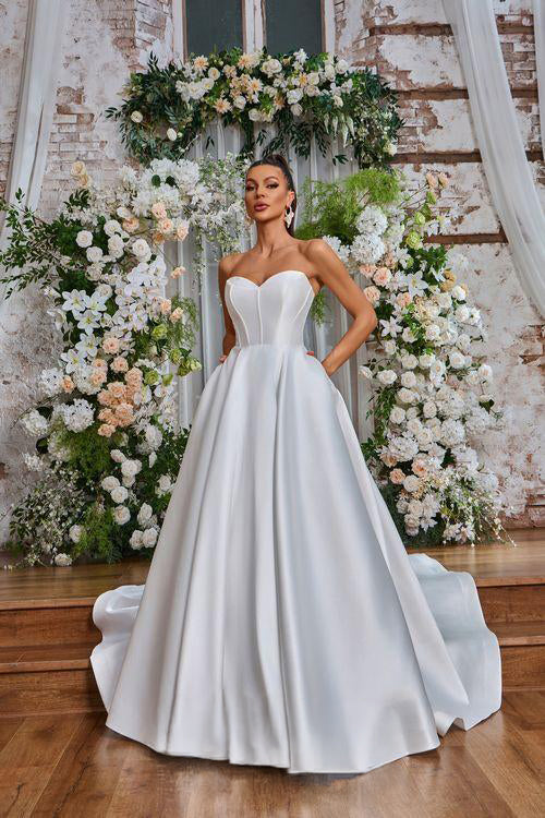 Indulge in luxury with our JA8004 wedding dress. This stunning piece features a sweetheart neckline and a strapless design, creating an elegant and timeless look. The ivory fabric flows into a floor length A-Line silhouette, complete with pockets for added convenience. Finished with delicate buttons, this dress is a true work of art.